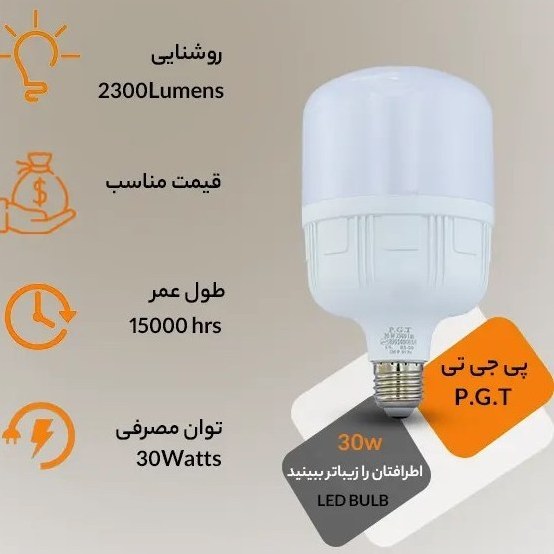 لامپ ال ای دی استوانه ای 30 وات پی جی تی PGT با سرپیچ استاندارد E27 با طیف وسیعی از سرپیچهای مرسوم در بازار برق ایران سازگار است.