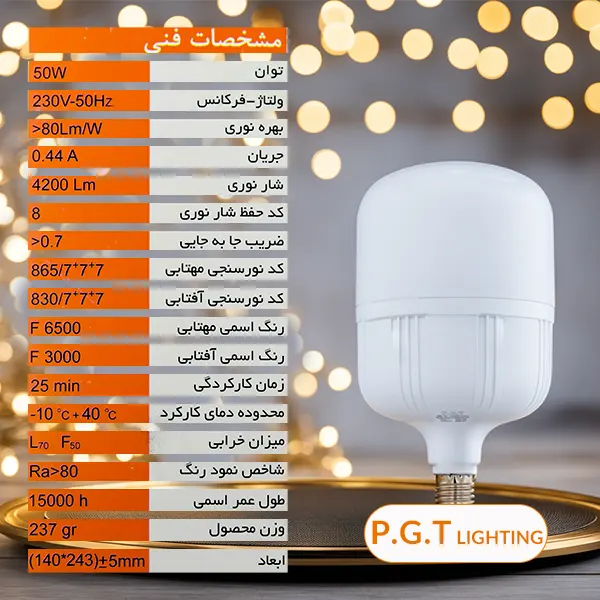 لامپ ال ای دی استوانه ای 50 وات پی جی تی PGT با سرپیچ استاندارد E27 با طیف وسیعی از سرپیچهای مرسوم در بازار برق ایران سازگار است.