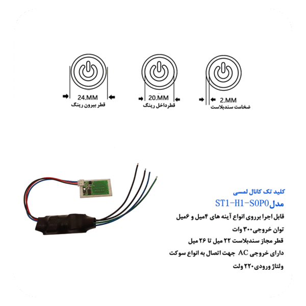 اگر به دنبال یک کلید لمسی حرفهای و قابل اطمینان برای اجرای آینههای نوری، تجهیزات روشنایی کممصرف یا مصارف مشابه هستید، مدل ST1-H1-S0P0 انتخابی ایدهآل است.این کلید برای روشن و خاموش کردن یک منبع نوری فقط با لمس انگشت از پشت اینه طراحی گردیده است.