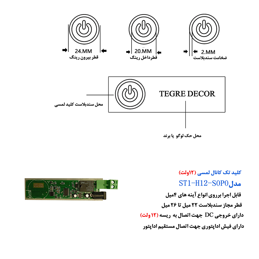 در کلید های لمسی رایج در بازار ، کلیدهای 12 ولت یکی از پرطرف دار ترین کلید های پشت اینه میباشد که به دلیل ایزوله بودن و امنیت بالایی که دارند مناسب ترین گزینه برای آینه های داخل حمام و مکانهایی که رطوبت بالا دارند میباشند.این کلید با اداپتورهای رایج بازار و با ولتاژ 12 ولت روشن میشود و برای ریسه های نوری با ولتاژ 12 ولت بسیار مناسب میباشد.